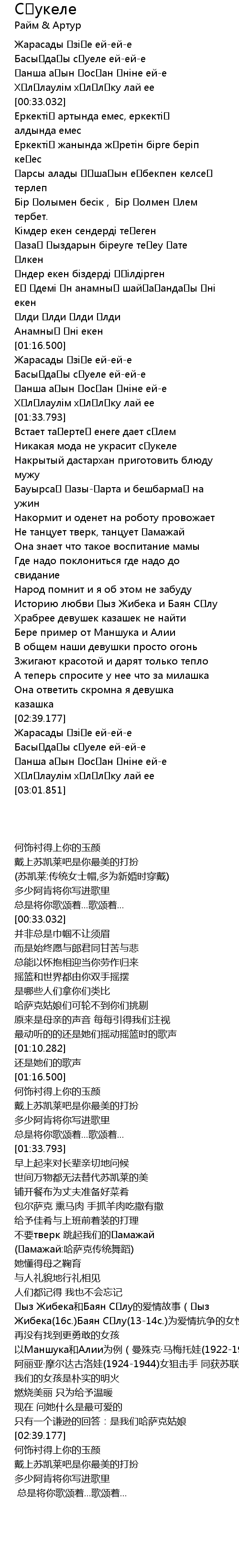 | [02:17.339] | Қыз Жибека和Баян Сұлу的爱情故事(Қыз Жибека(16c.)Баян Сұлу(13-14c.)为爱情抗争的女性形象) |