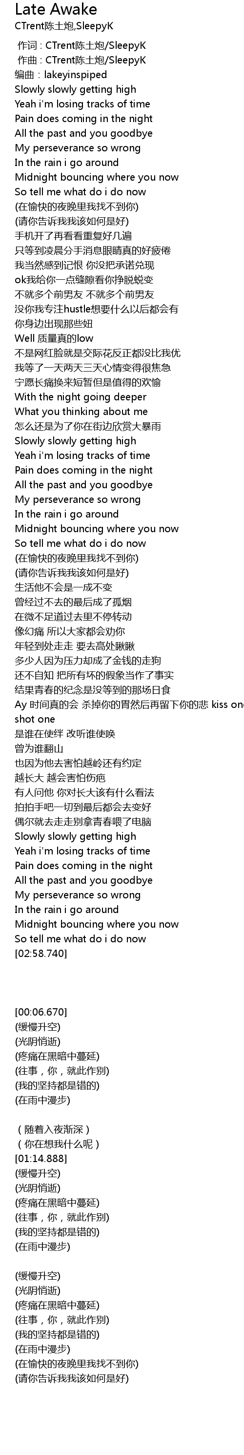 | [00:00.000] | 作词 : CTrent陈土炮/SleepyK |