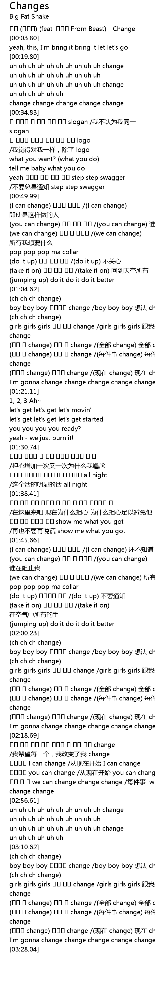 | [01:13.01] | (모두 다 change) 모두 다 change /(全部 change) 全部 change |