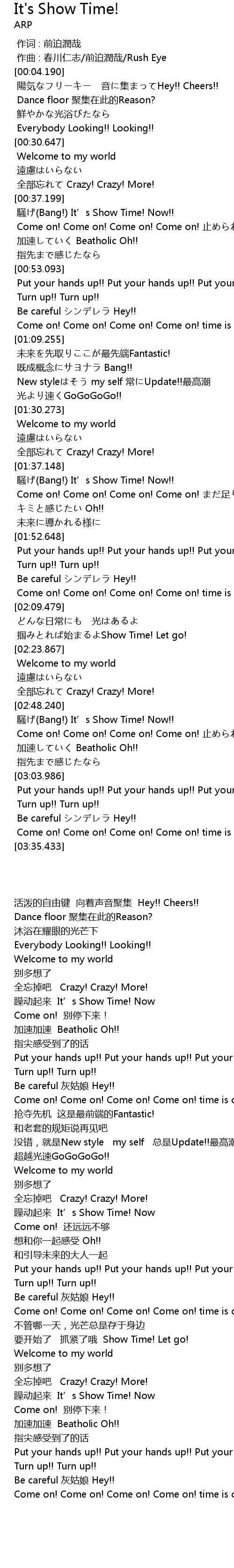 | [02:17.008] | 要开始了 抓紧了哦 Show Time! Let go! |