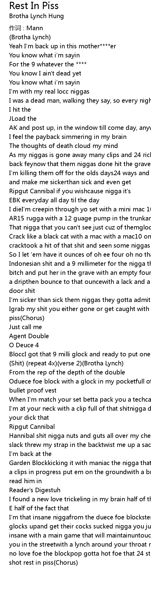 | BloccI got that 9 milli glock and ready to put one in your knot" Rest in Piss" Shit repeat 4x verse 2 Brotha Lynch | |