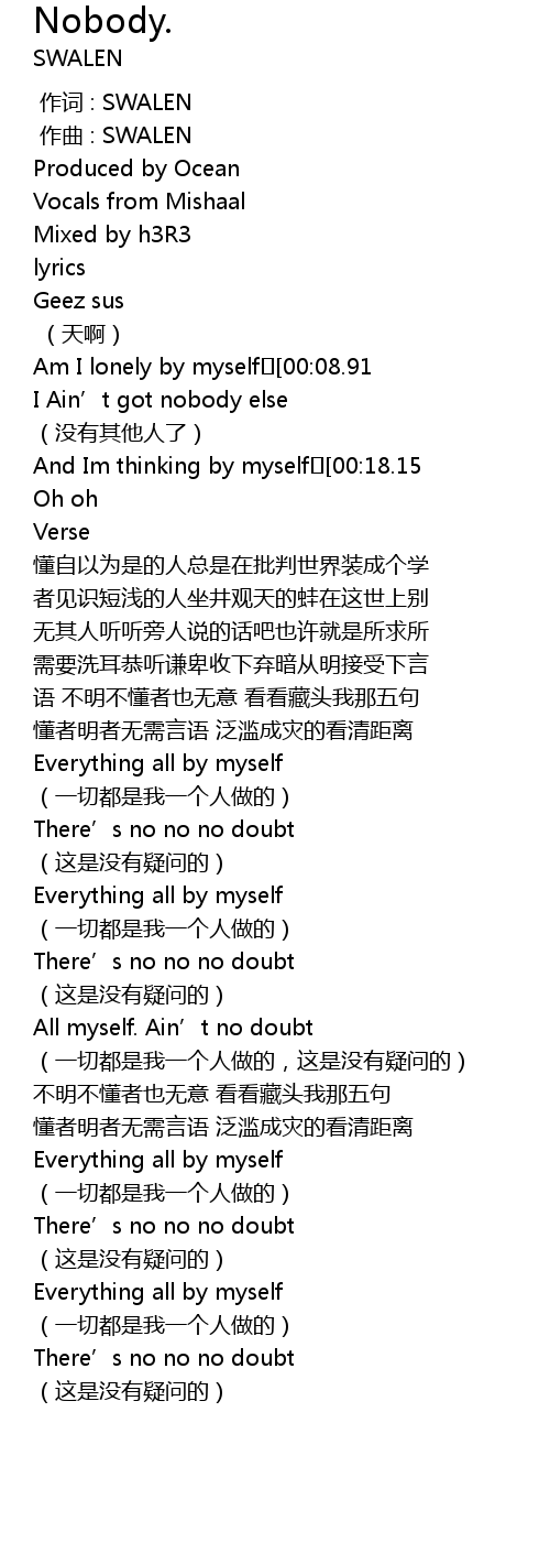| [00:06.57]Am I lonely by myself [00:08.91] | (只有我自己孤独吗) |