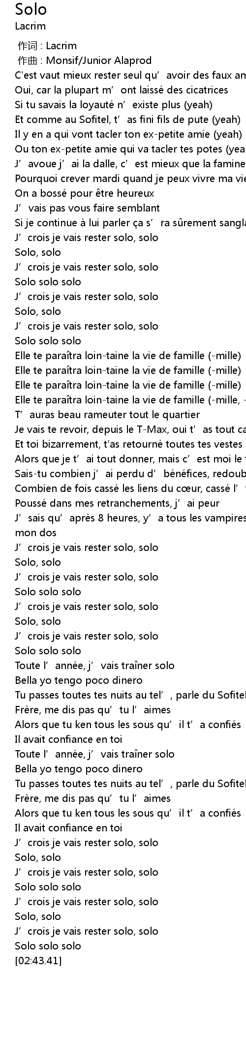 | [00:41.06] | J’crois je vais rester solo, solo |