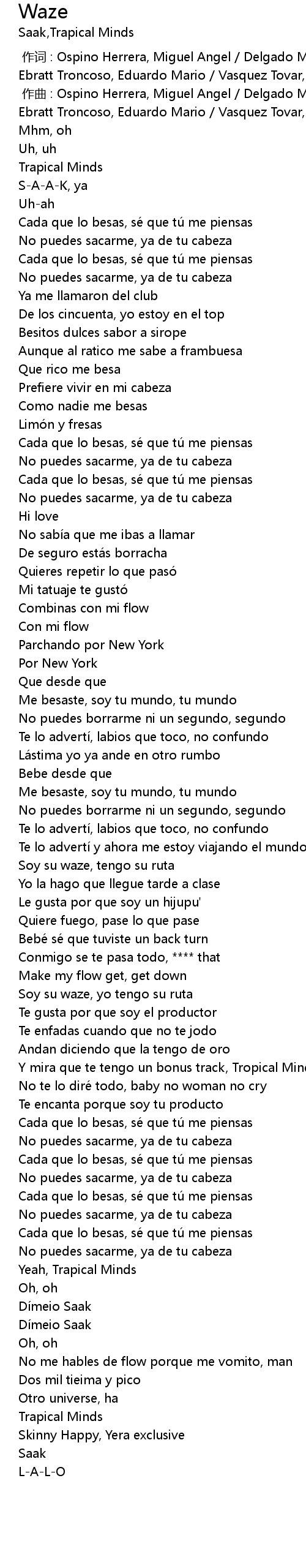 | [00:00.000] | 作词 : Ospino Herrera, Miguel Angel / Delgado Melguizo, Santiago / Ebratt Troncoso, Eduardo Mario / Vasquez Tovar, Camilo Santiago |