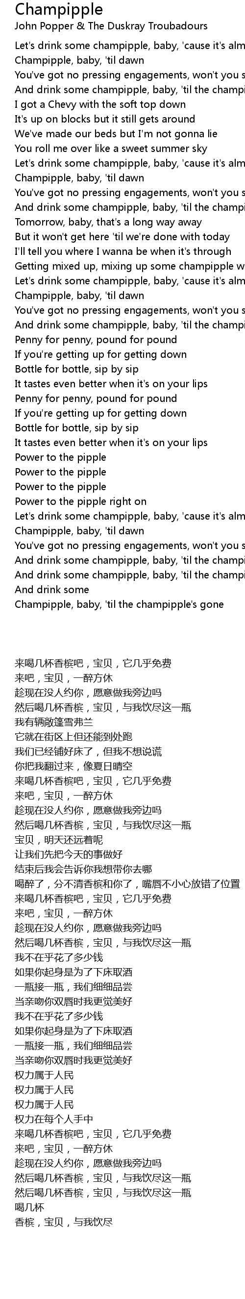 And drink some champipple, baby, 'til the champipple's gone |