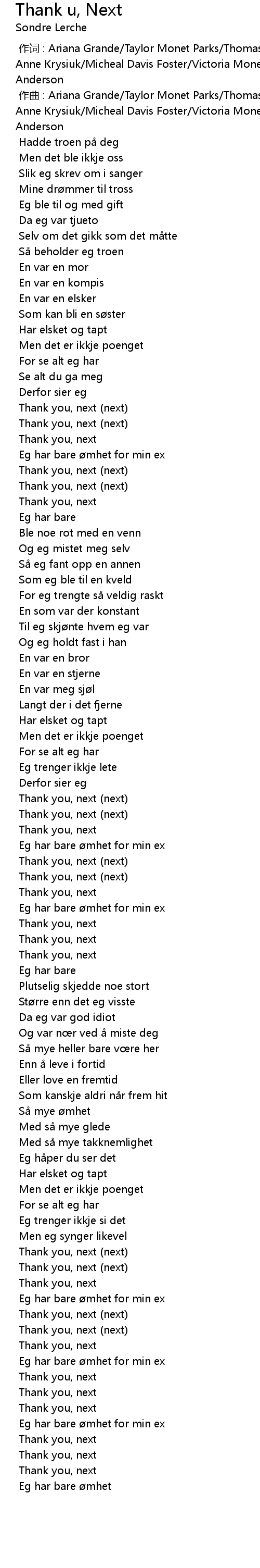 | [00:01.000] | 作曲 : Ariana Grande/Taylor Monet Parks/Thomas Lee Brown/Kimberly Anne Krysiuk/Micheal Davis Foster/Victoria Monet McCants/Charles Michael Anderson |