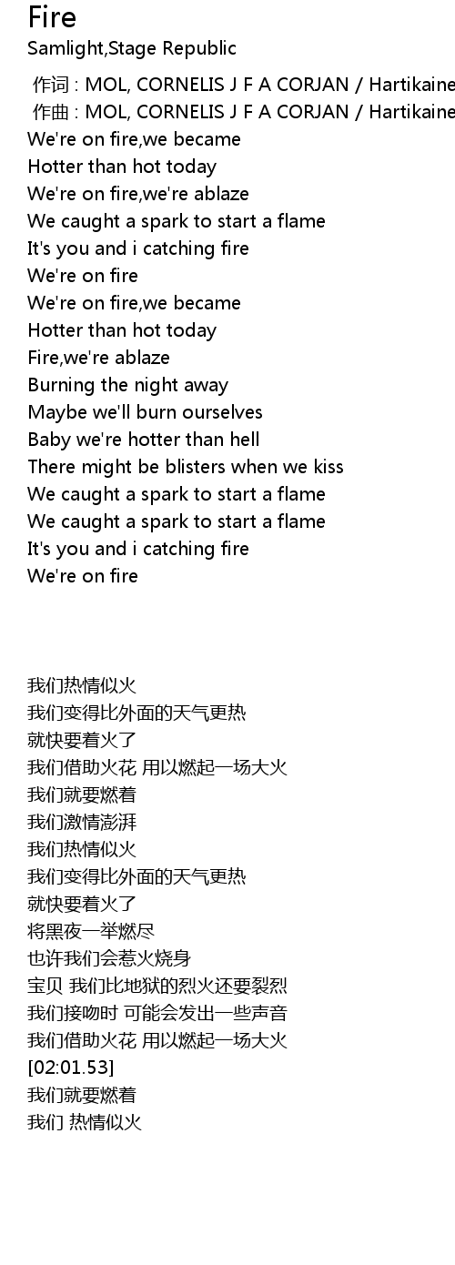 | [00:15.70] | We' re on fire, we became |