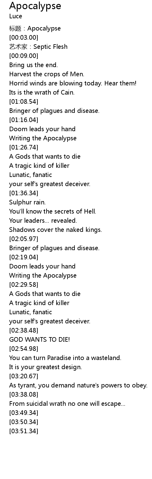 | [00:00.00] | biao ti: Apocalypse |