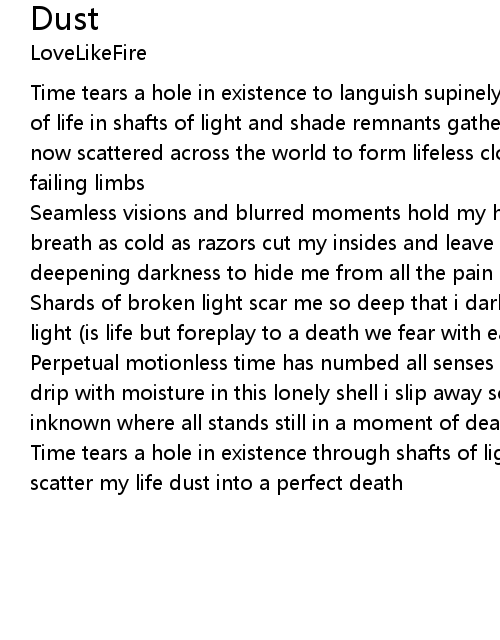 Time tears a hole in existence to languish supinely in torture see the essence of life in shafts of light and shade remnants gathered by trembling hands are now scattered across the world to form lifeless clouds of dust that bind my failing limbs