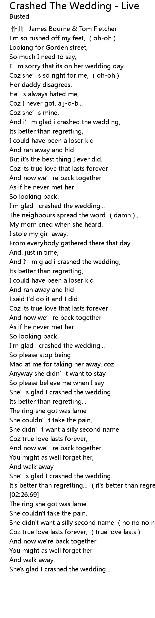 | [01:07.63] | I' m glad i crashed the wedding... |