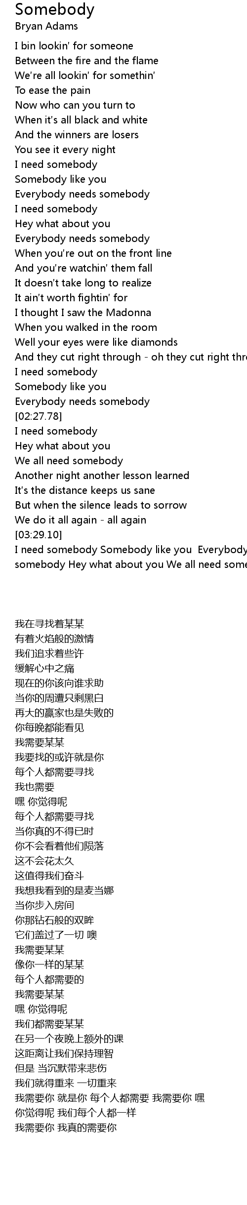 | [03:29.91] | I need somebody Somebody like you Everybody needs somebody I need somebody Hey what about you We all need somebody I need somebody I need somebody |