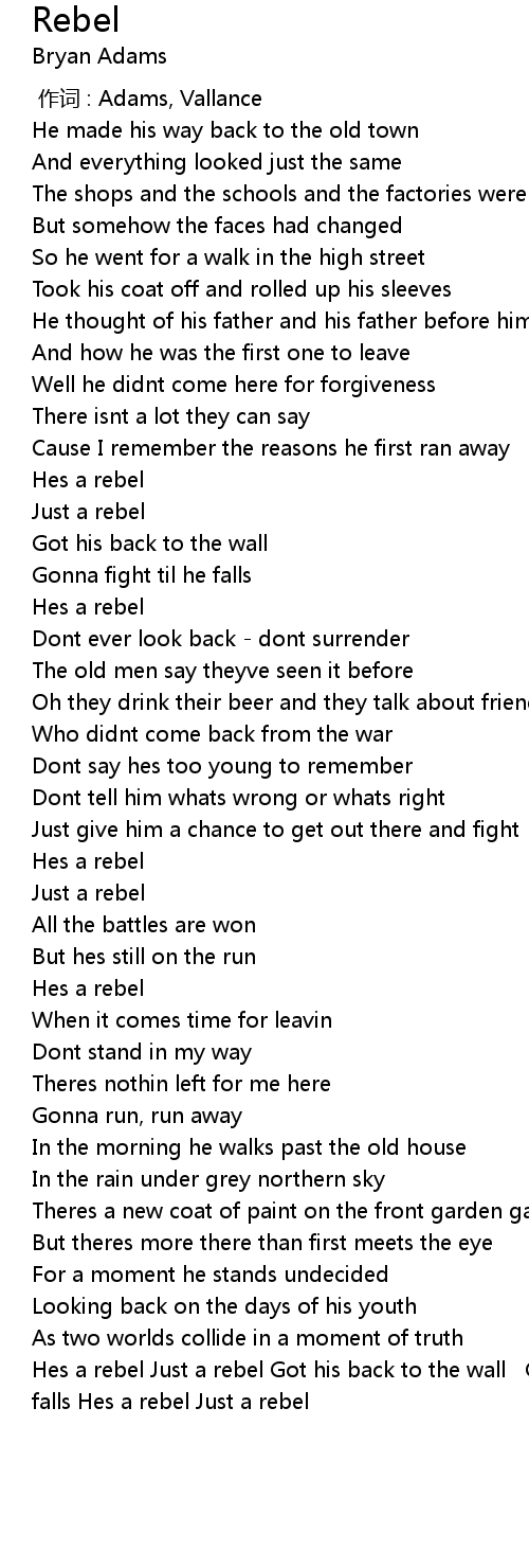 | [03:00.45] | Hes a rebel Just a rebel Got his back to the wall Gonna fight til he falls Hes a rebel Just a rebel |