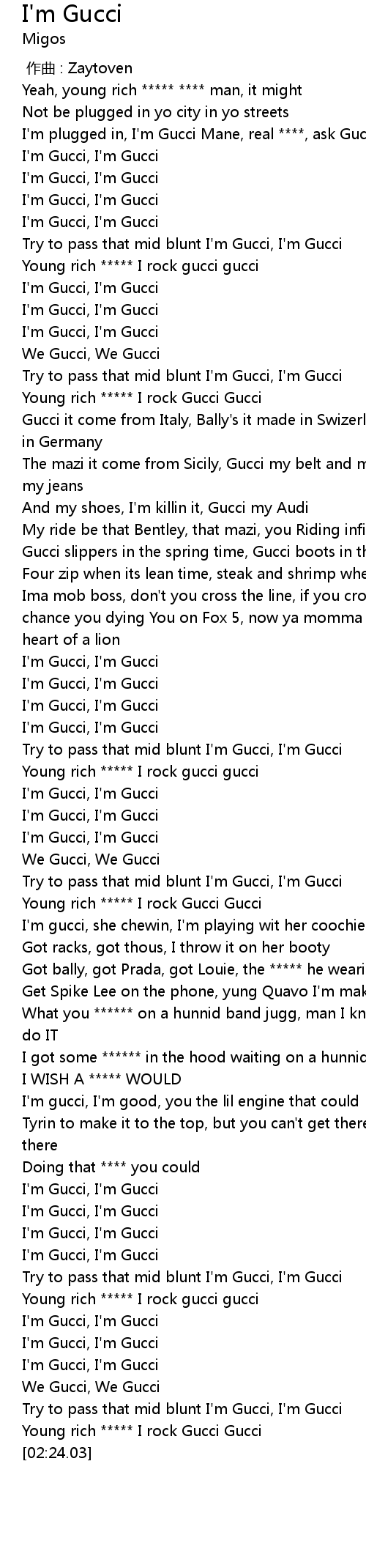 | [02:20.44] | Young rich ***** I rock Gucci Gucci |