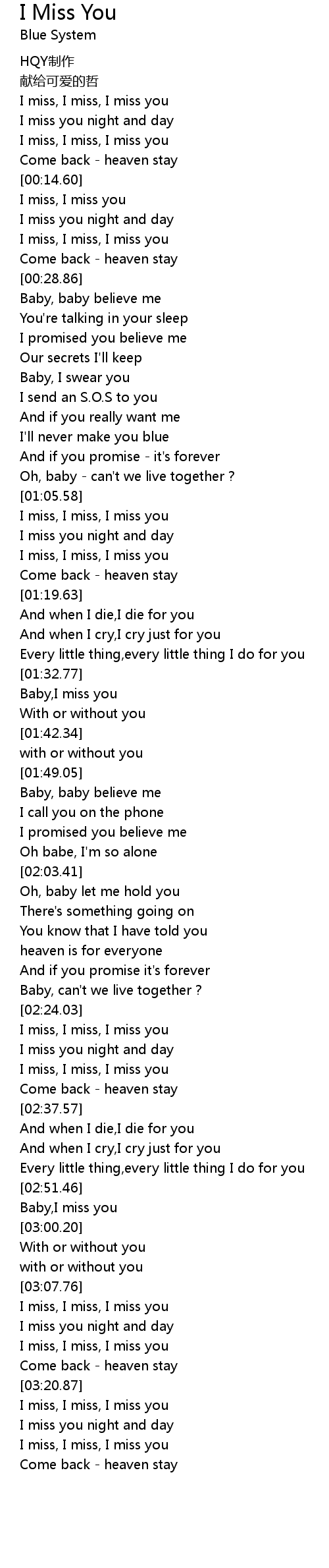 | [03:30.40] | I miss, I miss, I miss you |