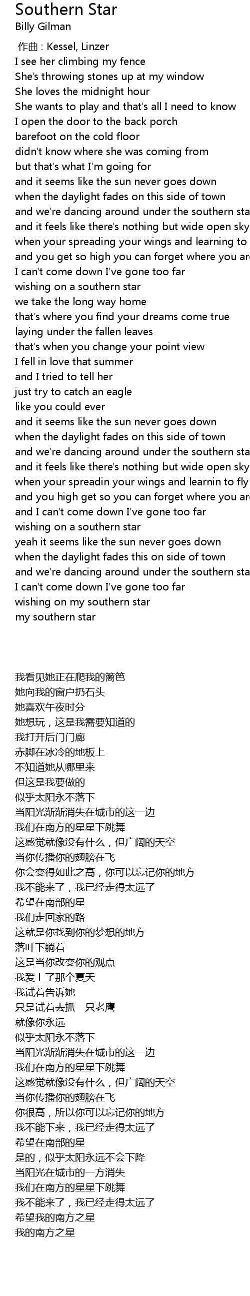 | [00:54.510] | and we' re dancing around under the southern stars |