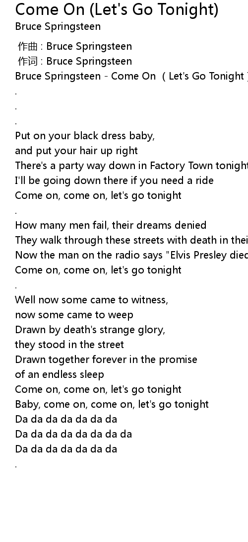 | [00:00.07] | Bruce Springsteen Come On Let' s Go Tonight |