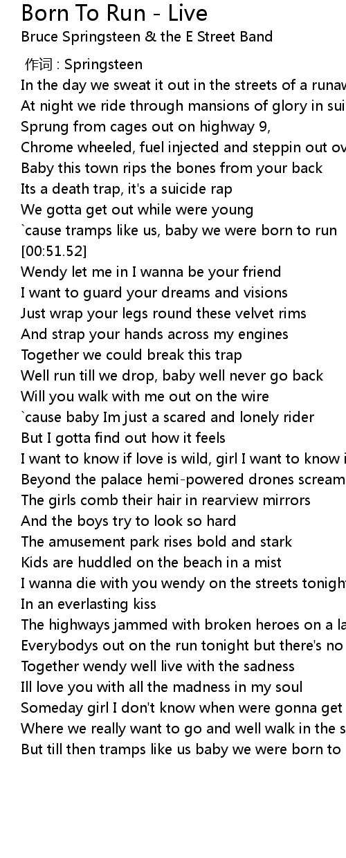 | [00:47.57] | `cause tramps like us, baby we were born to run |