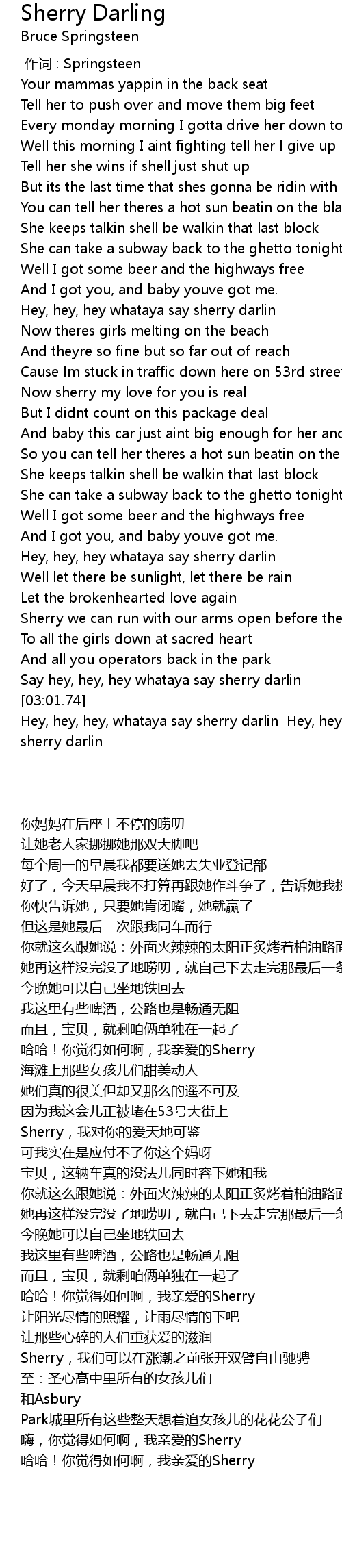 | [03:02.85] | Hey, hey, hey, whataya say sherry darlin Hey, hey, hey, whataya say sherry darlin |