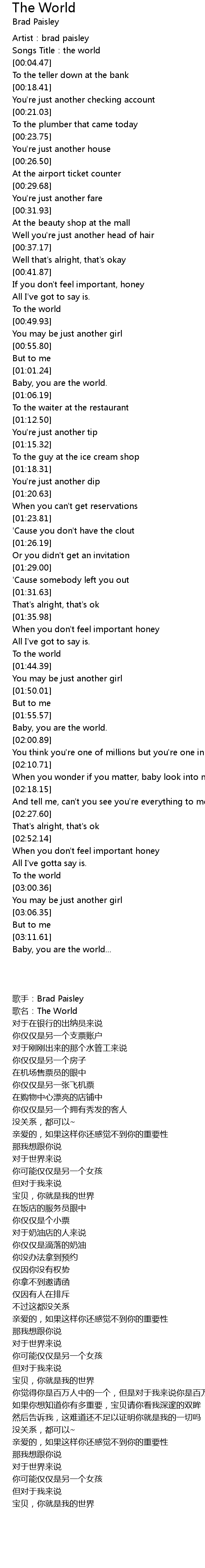 | [01:57.26] | Baby, you are the world. |
