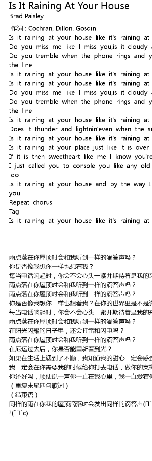 | [00:54.49] | Is it raining at your house like it' s raining at mine |
