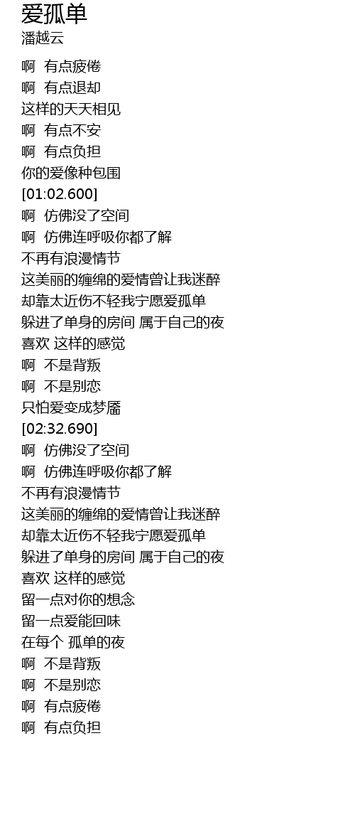 | [01:42.690] | 却靠太近伤不轻我宁愿爱孤单 |