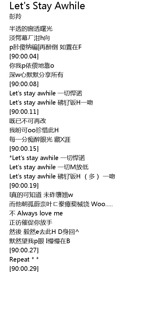 | [90:00.18] | Let' s stay awhile fú liǎo bǎn H duō yī wěn |