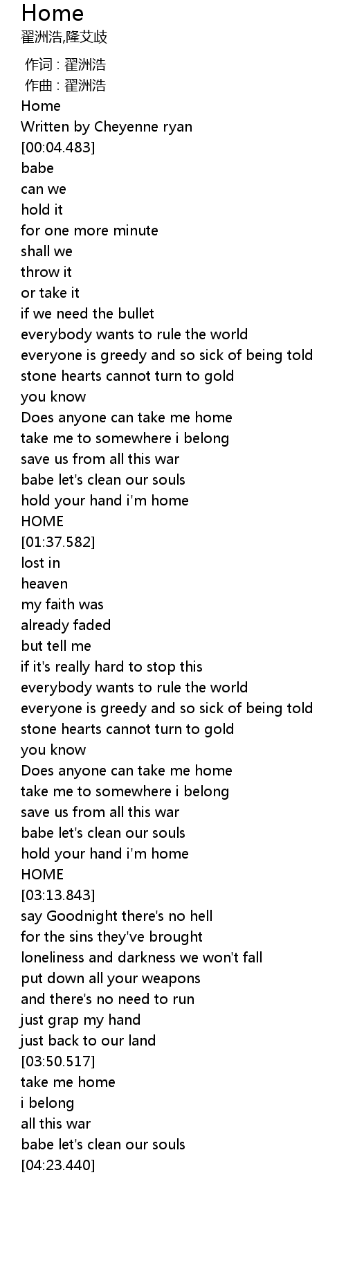 | [01:02.114] | take me to somewhere i belong |