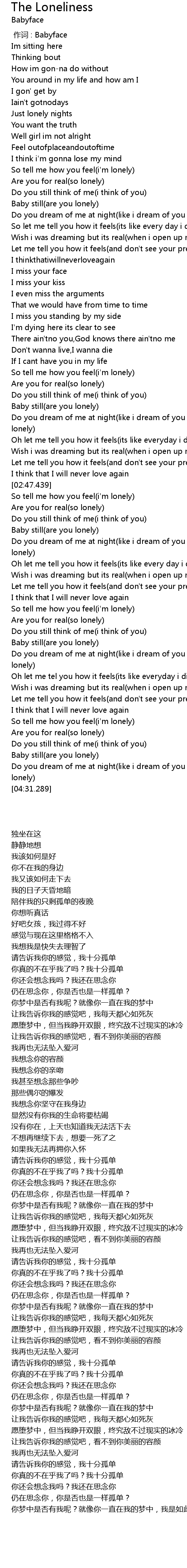 | [04:17.769] | So tell me how you feel(i'm lonely) |