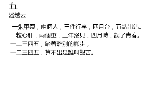 | 一張車票,兩個人,三件行李,四月台,五點出站。 | |
