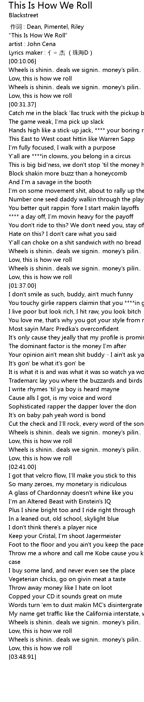 | [00:10.89] | Wheels is shinin.. deals we signin.. money's pilin.. |