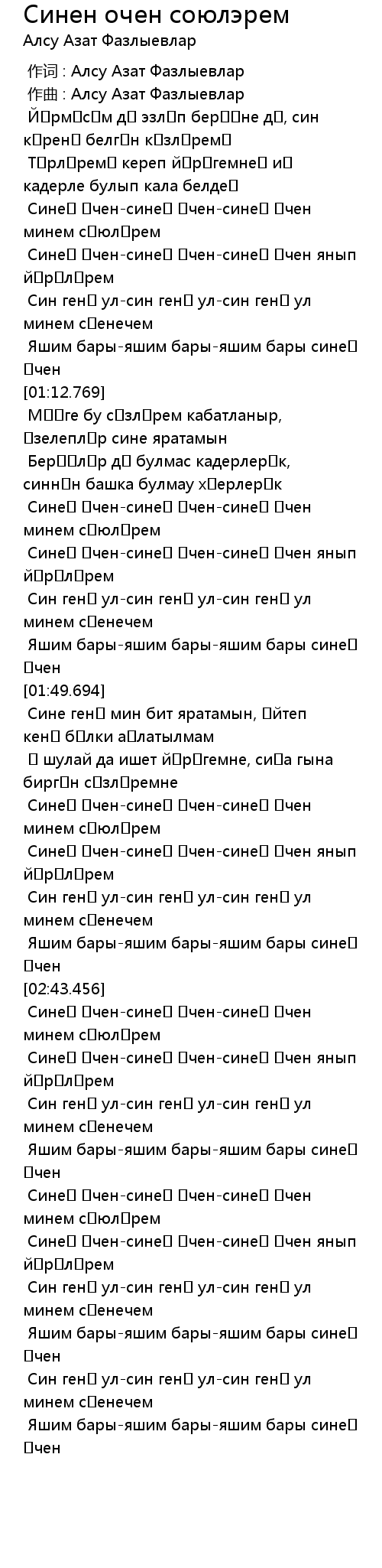 [01:40.171] Син генә ул-син генә ул-син генә ул минем сөенечем