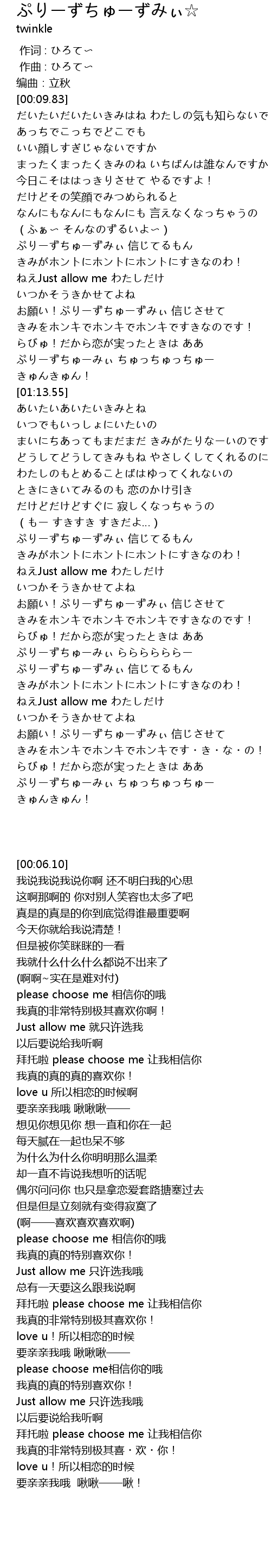 | [01:09.51] | ぷりーずちゅーみぃ ちゅっちゅっちゅー きゅんきゅん! |