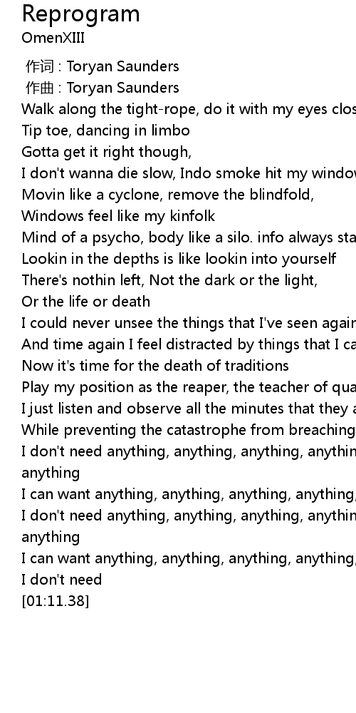 | [01:00.42] | I don' t need anything, anything, anything, anything, anything, anything |