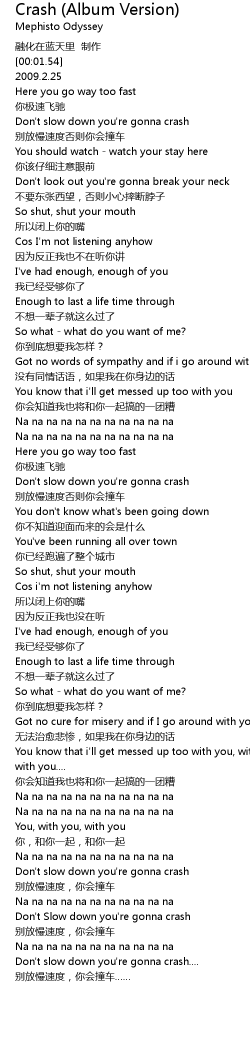 | [02:21.69] | Don' t slow down you' re gonna crash |