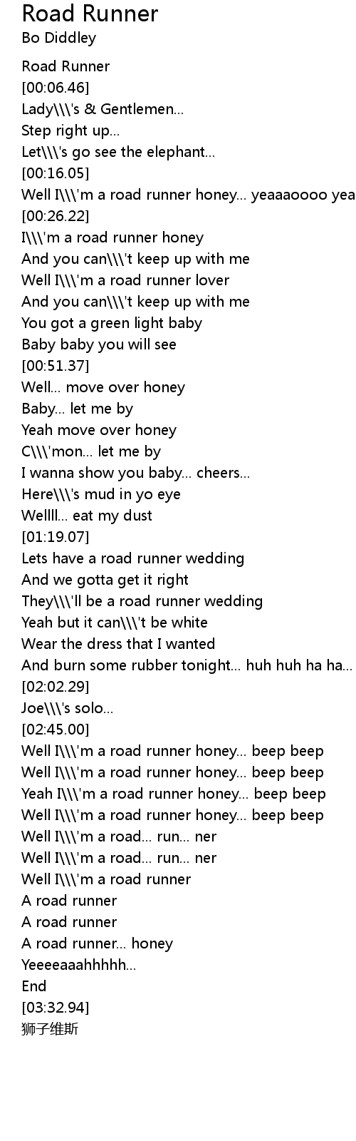 | [02:58.88] | Well I\\\'m a road runner honey... beep beep |