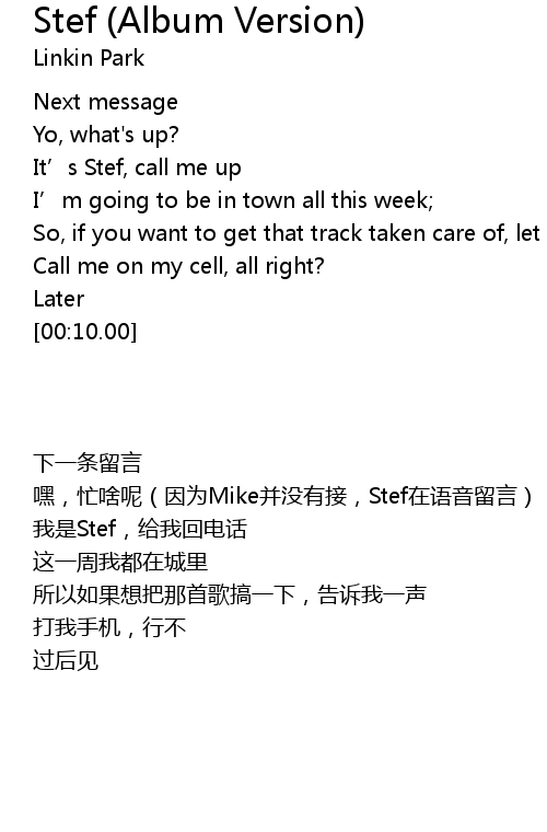 | [00:01.33] | 嘿,忙啥呢(因为Mike并没有接,Stef在语音留言) |