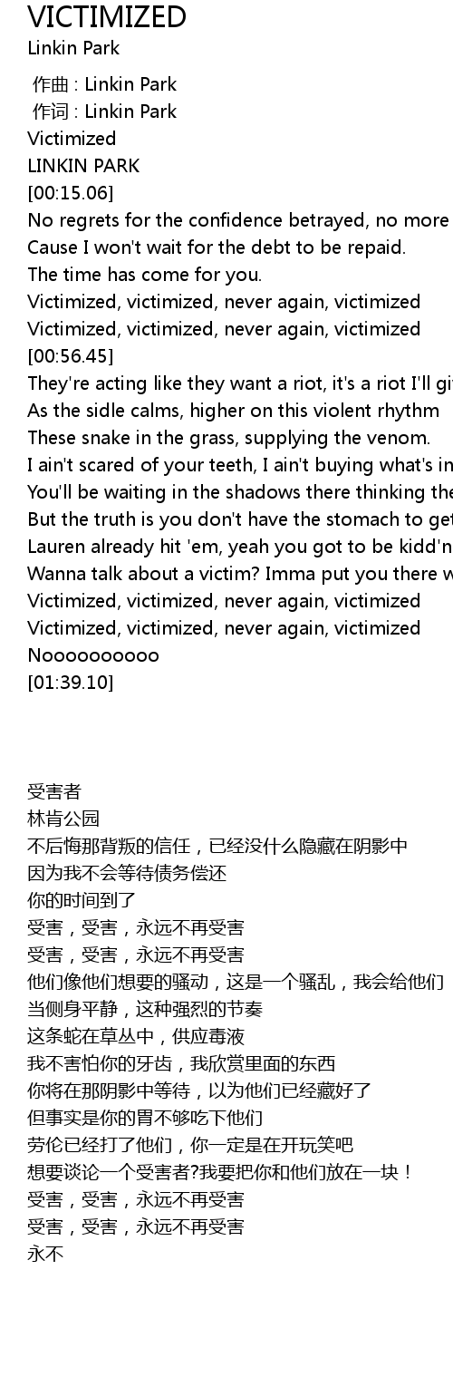 | [00:46.03] | Victimized, victimized, never again, victimized |