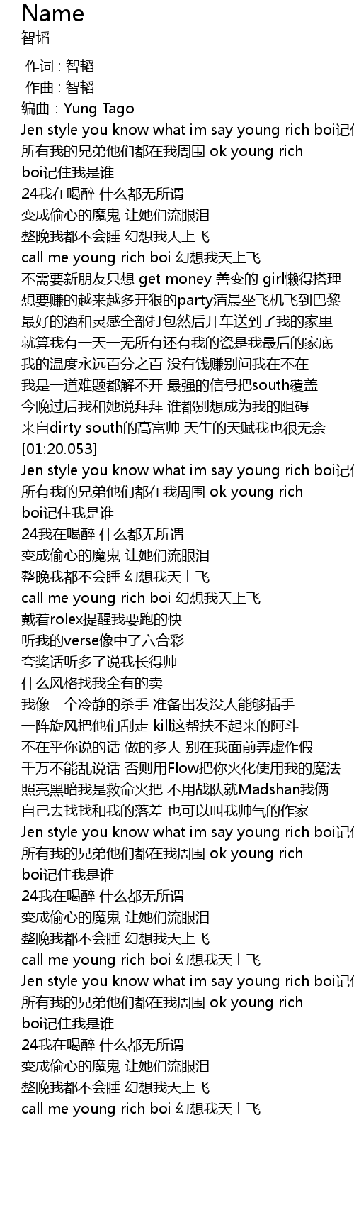 | [01:20.553] | Jen style you know what im say young rich boi记住我是谁 |