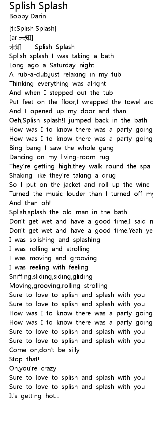 | [00:19.299] | Oeh, Splish splash! I jumped back in the bath |