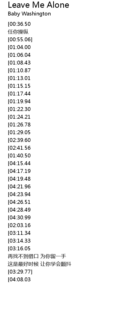 | [04:12.40][04:08.03][04:03.54][03:59.01][03:54.47] | Hey Leave Me Alone |