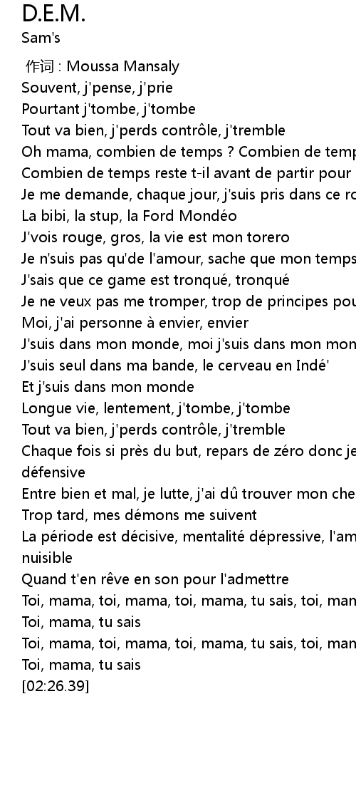 | [00:37.93] | Oh mama, combien de temps ? Combien de temps ? |