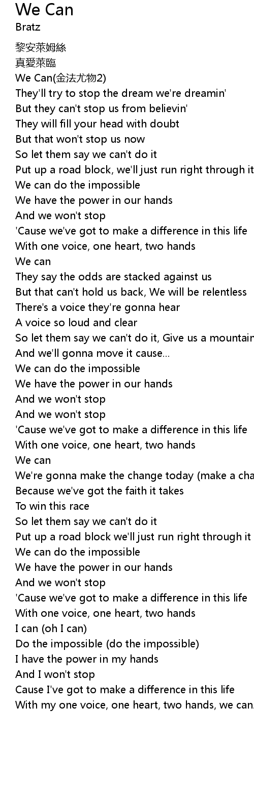 | [03:20.66] | With my one voice, one heart, two hands, we can. |