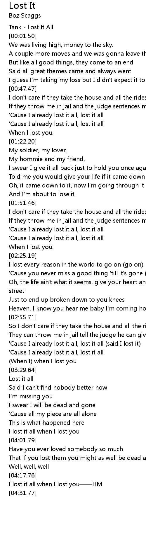 | [03:10.63] | ' Cause I already lost it all, lost it all said I lost it |