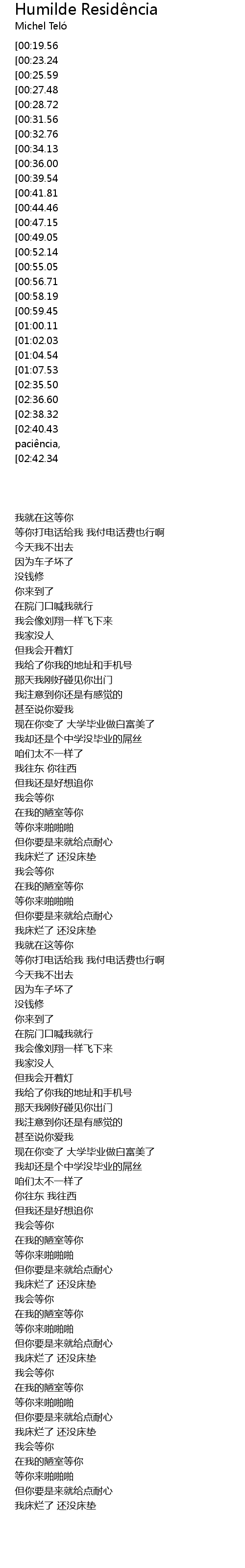 | [02:46.91][02:36.60][02:25.88][01:11.04] | Na minha humilde residência |