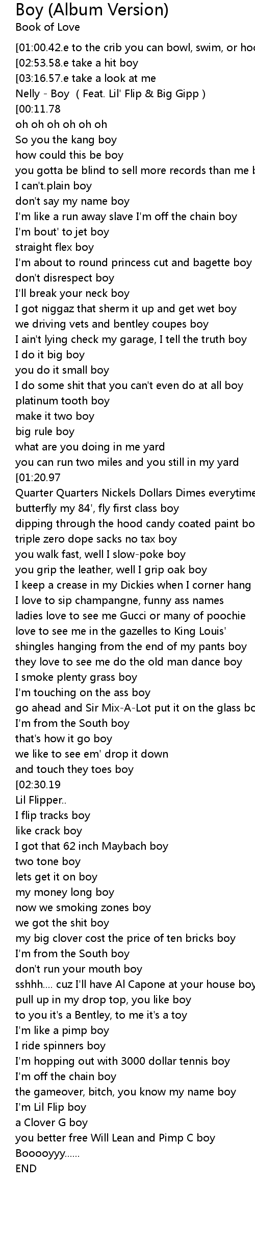 | [00:00.00] | Nelly - Boy (Feat. Lil' Flip & Big Gipp) |