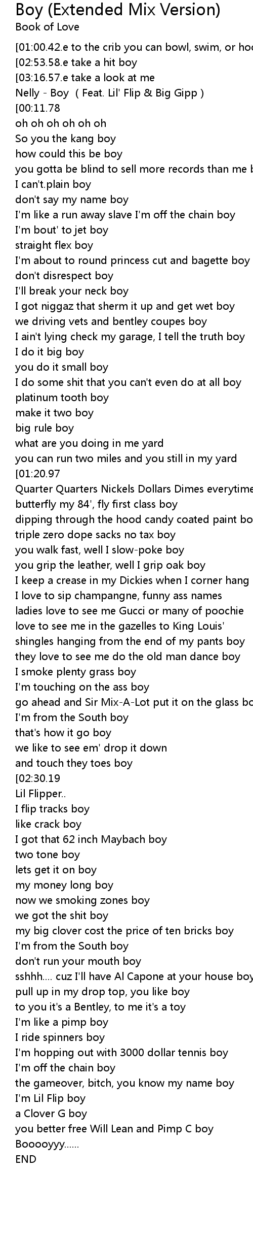 | [00:00.00] | Nelly - Boy (Feat. Lil' Flip & Big Gipp) |