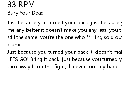| Just because you turned your back, just because you turned away, it doesn't make me any better it doesn't make you any less, you think your better, my ideals are still the same, you're the one who ****ing sold out, you're the only one to blame. | |