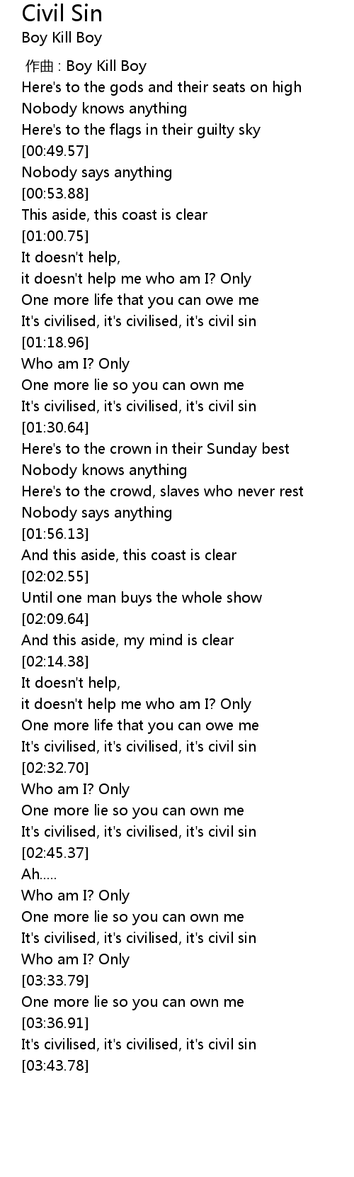 | [03:37.72] | It's civilised, it's civilised, it's civil sin |