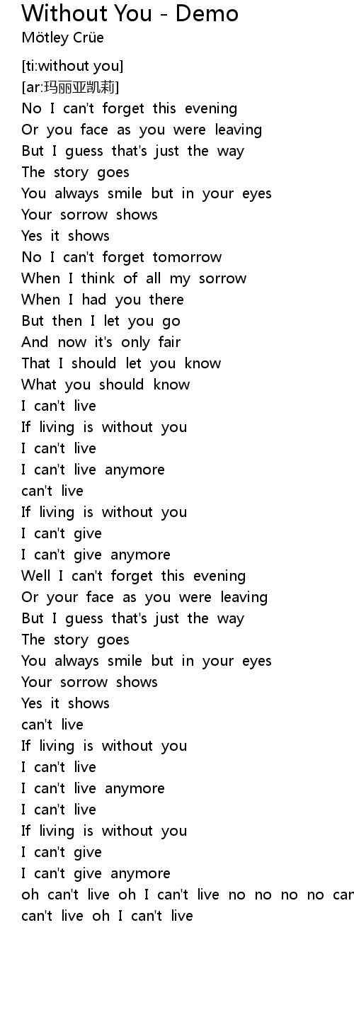 | [02:48.854] | oh can' t live oh I can' t live no no no no can' t live oh can' t live oh I can' t live |