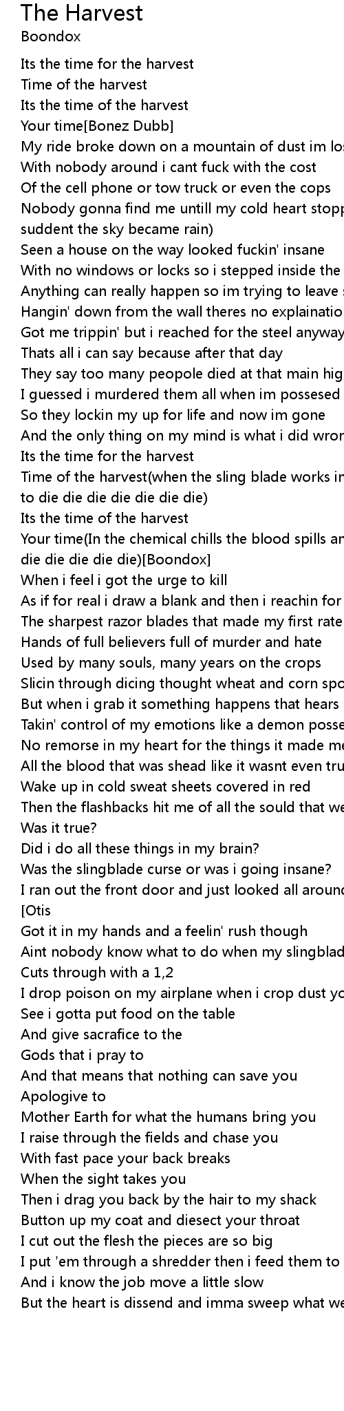 Time of the harvest(when the sling blade works in ways thats so sticky to yall to die die die die die die die) |